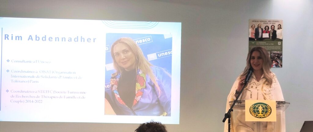 Soraya Ayouch, psychologue à la Protection Judiciaire de la jeunesse. Elle a exprimé qu’en célébrant la Journée de la Femme, on célèbre aussi la vie. Le thème de l’égalité et du respect nous invite à parler de la vie, de la femme, du couple, de la paix. Travaillant avec des enfants en situation difficile, elle a constaté que souvent leurs actes interpellent les parents et la société dans leur désir d’amour. Sa conclusion était que les femmes unies peuvent apporter un message de paix et d’espoir malgré les obstacles et les difficultés que traverse ce monde aujourd’hui.