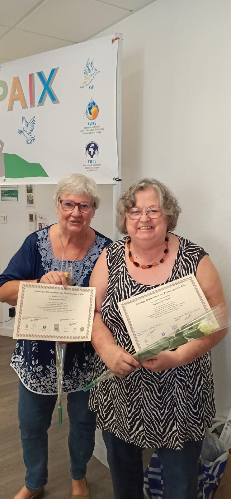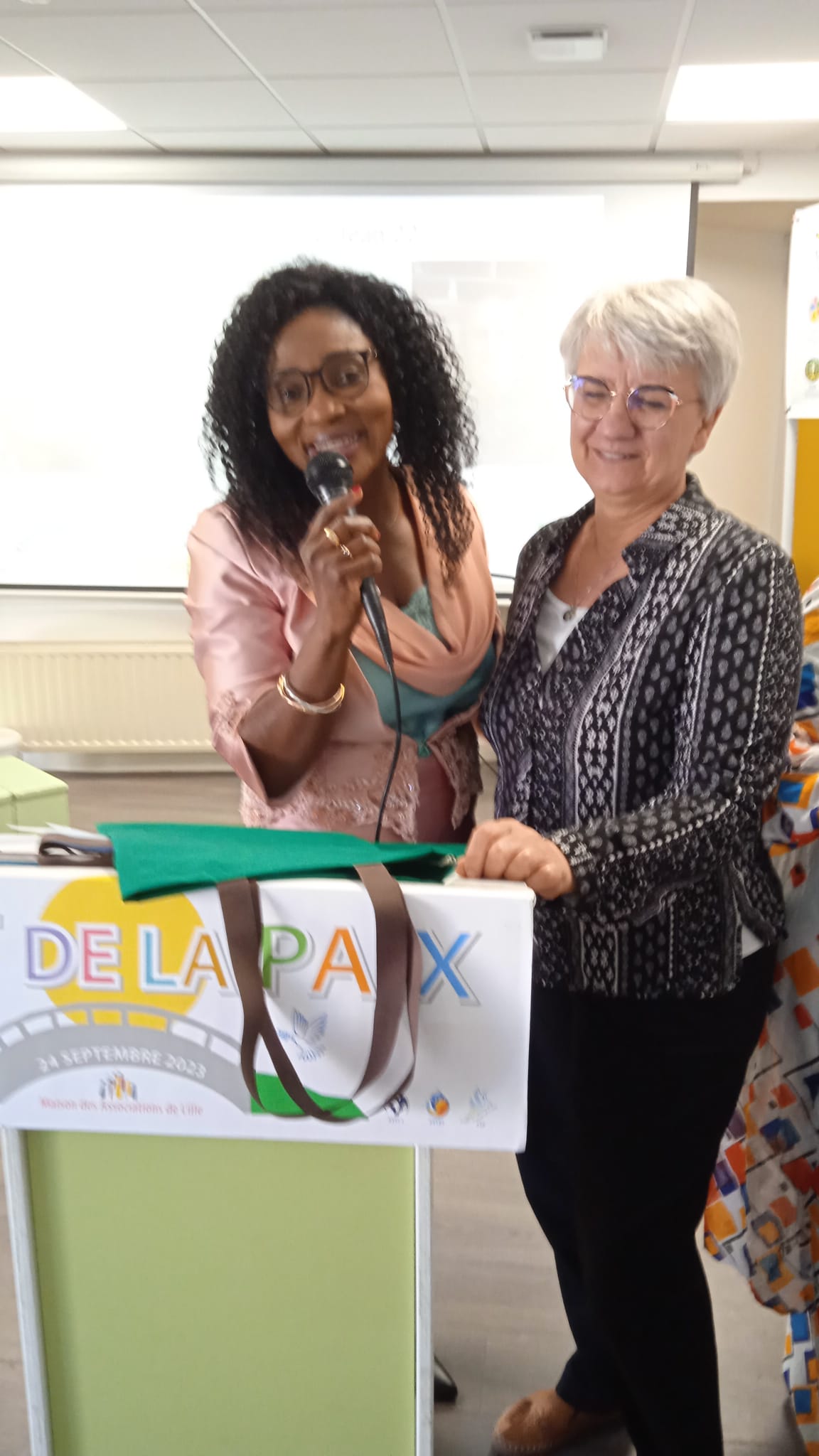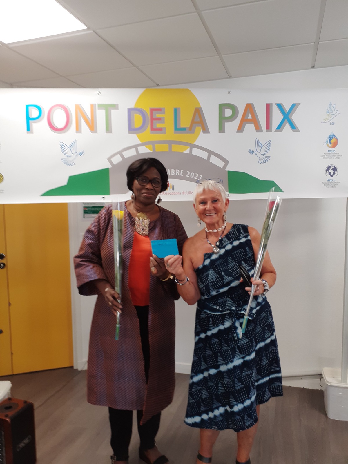 Des stands de 10 associations dont l’association « Un petit bagage d’amour » qui prend soin de jeunes mamans seules avec leur bébés et l’Association FANA qui mène beaucoup d’actions partenaires pour la solidarité internationale, entouraient le public et, à l’avant de la salle, se trouvait un PONT DE PAIX coloré fait à la main, à côté d’une grande exposition de drapeaux du monde et d’une nouvelle création : l’ARBRE DE PAIX.