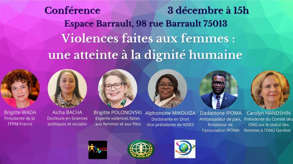 Le samedi 3 décembre 2022, la Fédération des Femmes pour la paix mondiale (FFPM) en partenariat avec l’Association Internationale pour le Développement Economique et Social – Afrique / France (AIDES/A.F) a organisé à Paris un événement en présentiel et par zoom sur le thème : « violences faites aux femmes : une atteinte à la dignité humaine ». Cet événement marquait la journée internationale de l’élimination des violences à l’égard des femmes (25/11) et la journée des droits de l’homme (10/12).