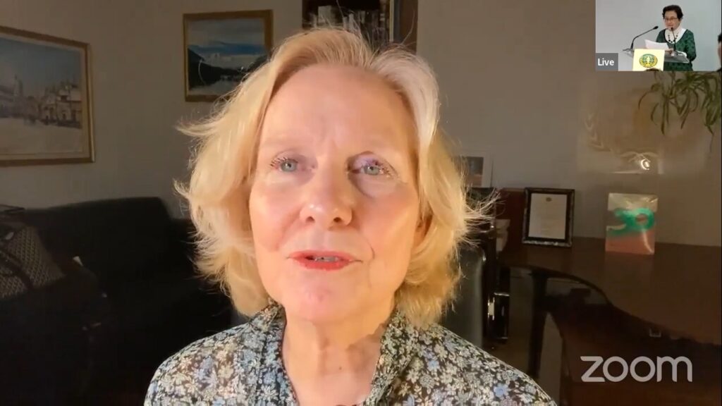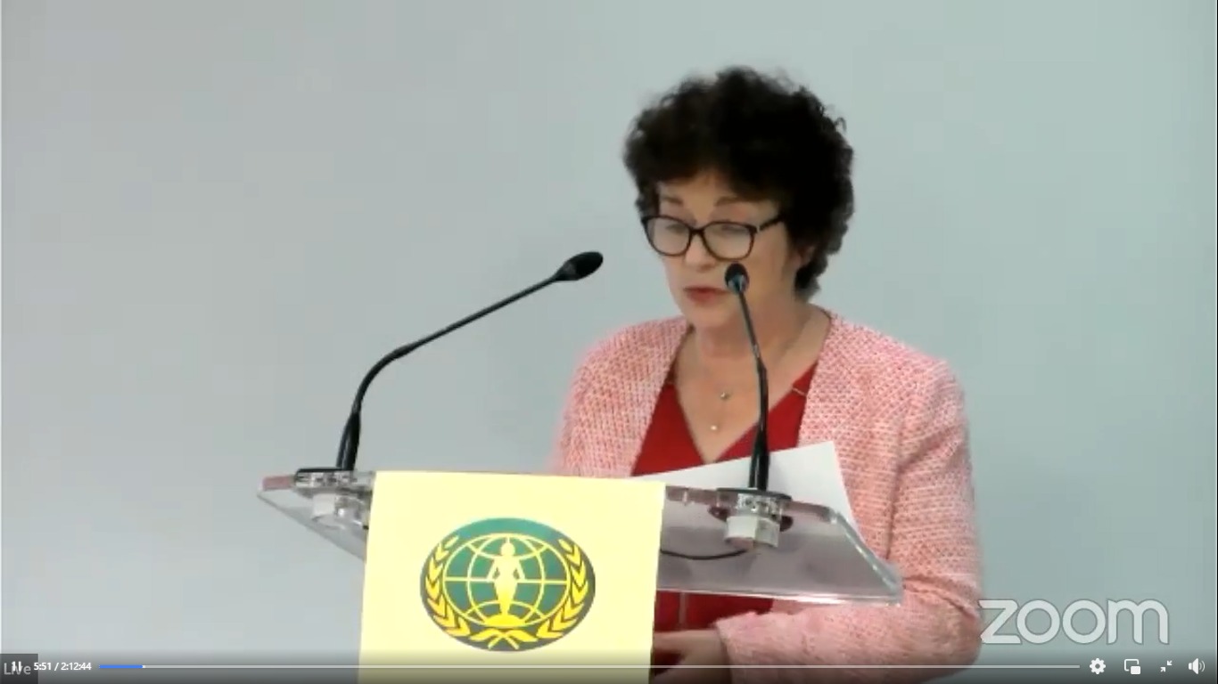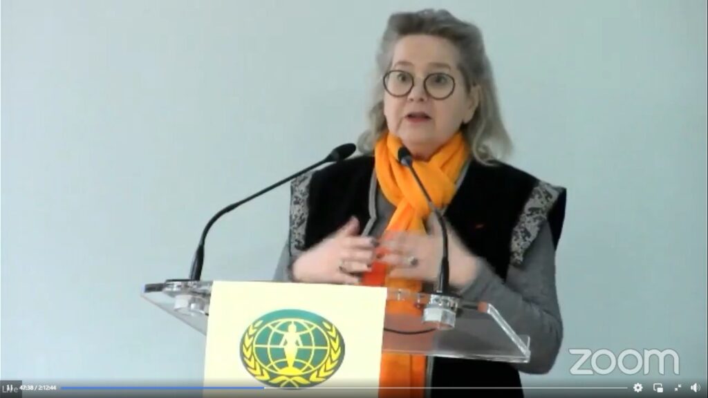 Avec son écharpe orange, Mme Brigitte Polonovski, experte en droits humains dans le domaine des violences faites aux femmes, représentante permanente auprès des Nations Unies pour le Conseil International des Femmes, nous a rappelé que nous étions en pleine campagne internationale « Oranger le monde », une campagne de 16 jours d’activisme contre la violence faite aux femmes. En s’appuyant sur de nombreuses statistiques, elle a aussi relevé le fait que la pandémie avait accentué la violence envers les femmes dans le monde.